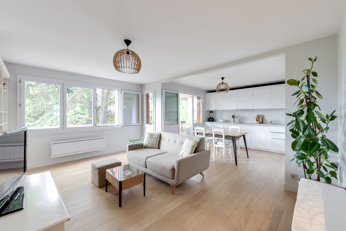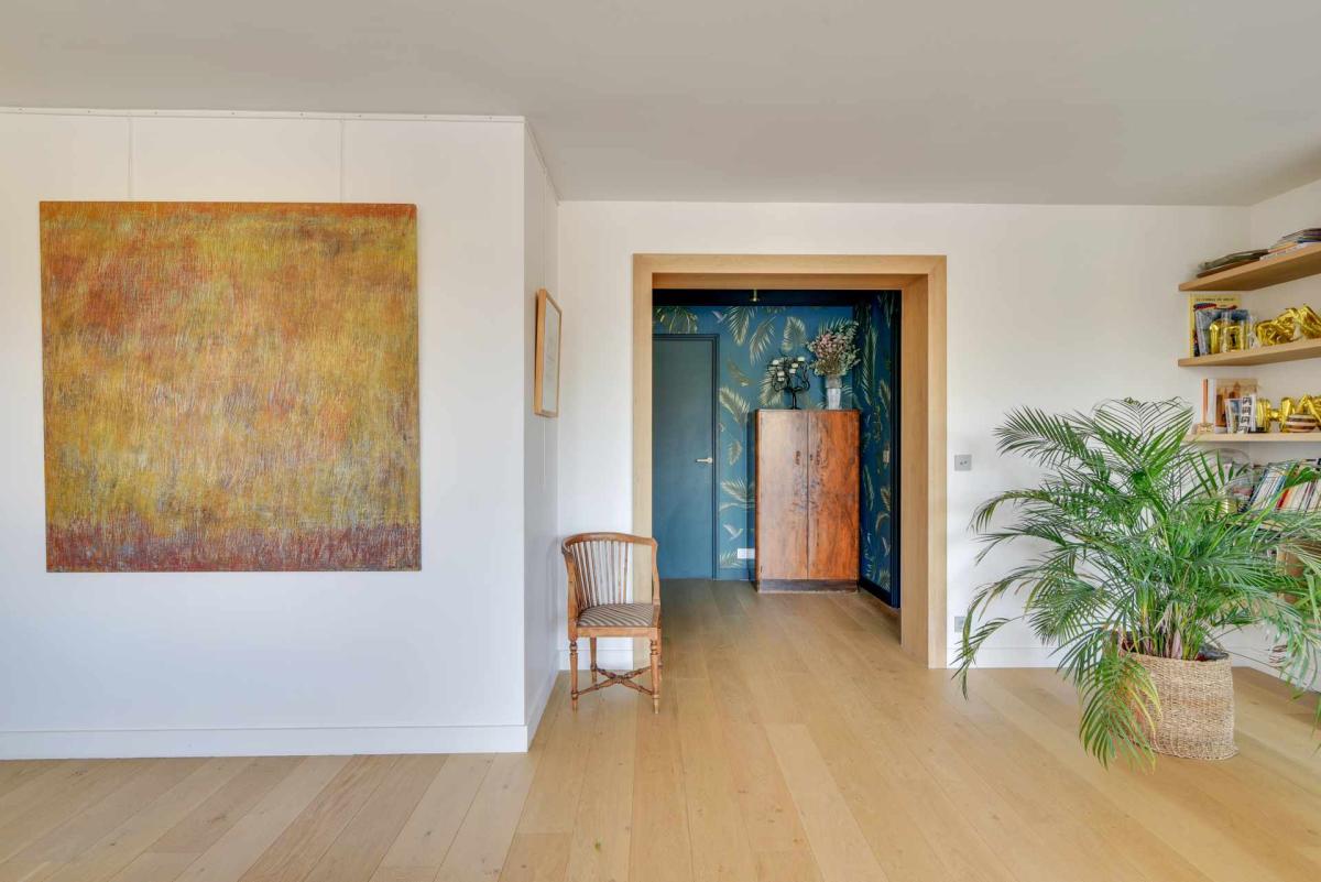 La cloison qui séparait la chambre parentale et le séjour a donc été ouverte afin de faire communiquer la nouvelle salle à manger et le salon.