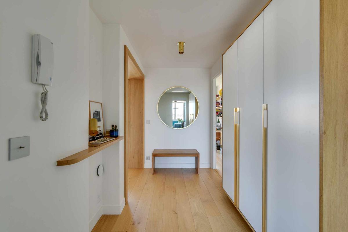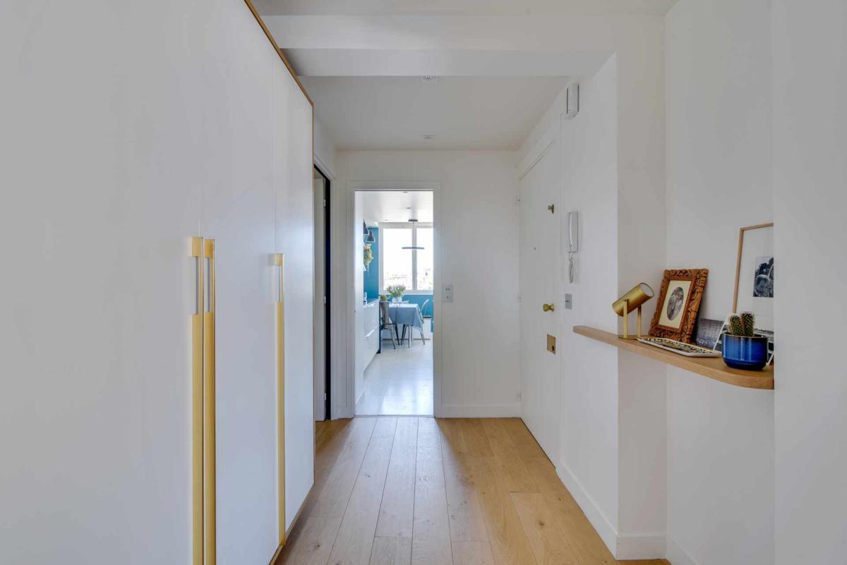 Dans le quartier de la mairie à Asnières, au sixième et dernier étage, deux chambres de bonne de 9m² chacune ont été réunies pour créer un studio.