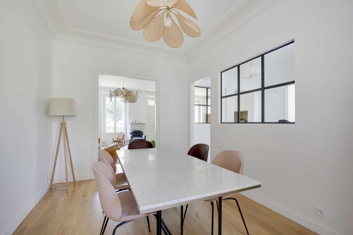 A l'emplacement de la porte donnant accès à l'ancienne chambre - (nouvelle salle à manger) : une verrière avec un cadre en chêne a également été réalisée sur mesure.